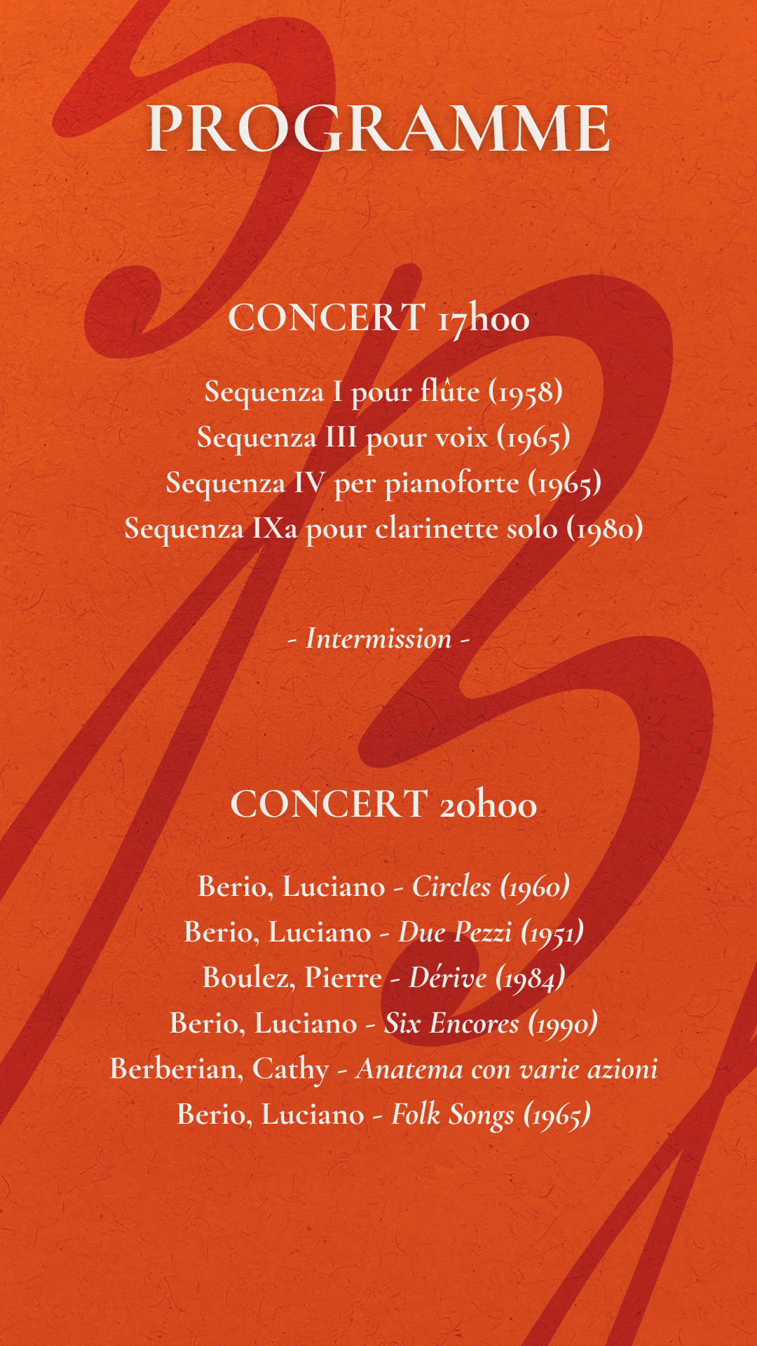 5–7 p.m.: First Berio Concert / Sequenzas (performed by Sarah Albu, Gwénaëlle Ratouit, Pamela Reimer and Jeffrey Stonehouse)